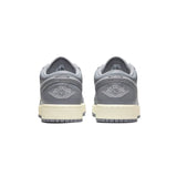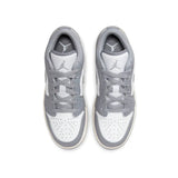 Air Jordan 1 Low is a retro-release of the Dunk Low line. The GS branding means that the shoe is designed for kids. The Vintage Grey Air Jordan 1 Low Gradeschool has a pristine white leather upper and perforated toe box. This is accessorized with gray overlays, laces, Swooshes, heel cap, and rubber outsole. Theres an embroidered gray Jumpman logo on the white tongue and insole. Inside the shoe is a gray, padded mesh fabric. The shoe also features white wings on the heels. A vintage-style rubber midsole completes the design. This Air Jordan 1 Low GS was released on September 2, 2022.